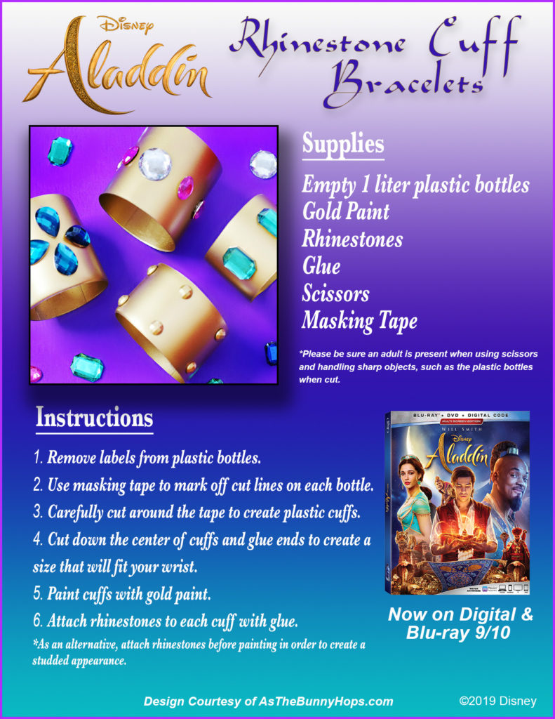 In celebration of the release, As The Bunny Hops has created a jewelry design inspired by Princess Jasmine! Take a look at the DIY instructions below for Rhinestone Cuff Bracelets,