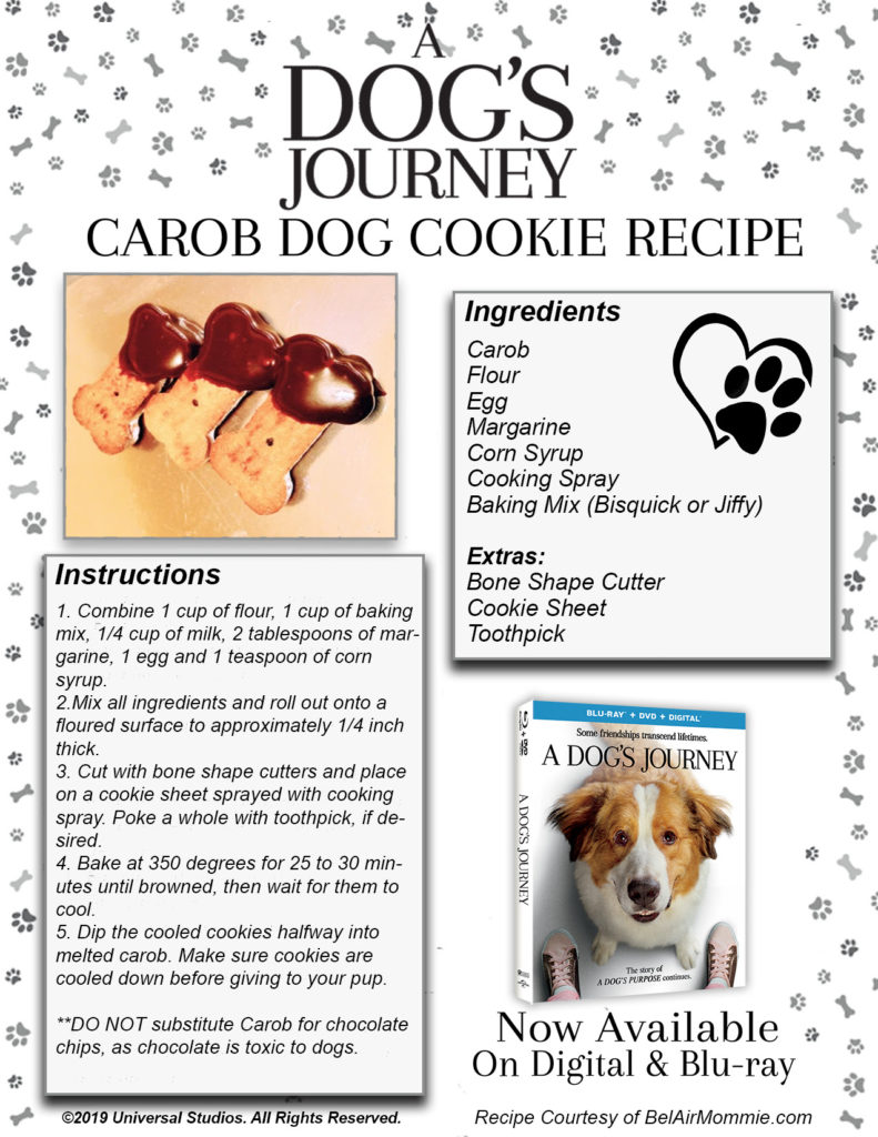 In celebration of the “pawsitively” uplifting film now available on Digital, Blu-ray and DVD, BelAirMommie has created a Carob Dog Cookie recipe, the perfect treat for any pup! Take a look at the recipe below and please share with your audience to encourage them to cook up a yummy snack for their favorite furry friends and then watch the inspiring film together as a family!