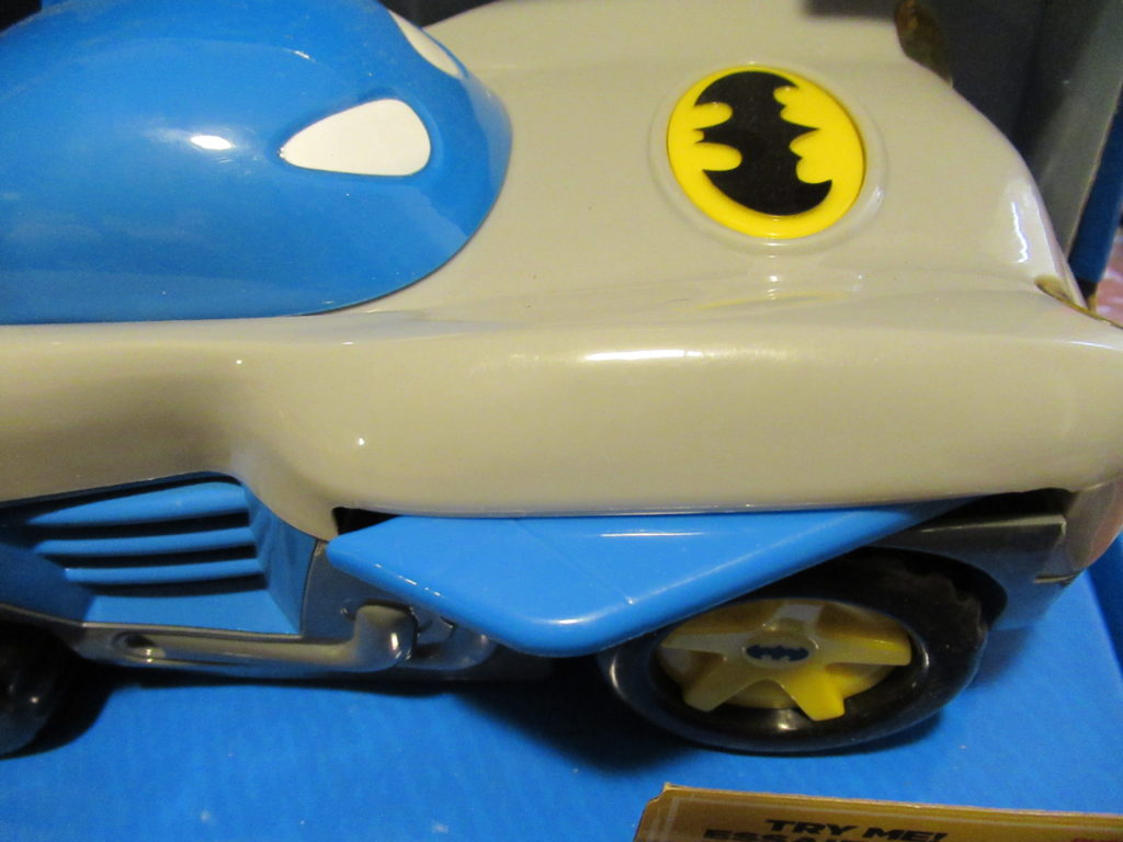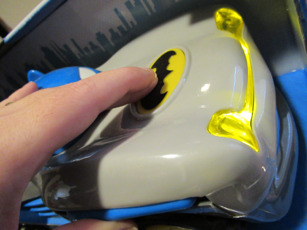 The Batman racer is awesome push the Batman logo to activate lights and theme music. Push the logo twice to send watch the racer take off. Convert the vehicle into race mode by moving the windshield forward to make the wings pop out.