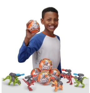 5 Surprise Dino Strike Unbox, build, and battle all new 5 Surprise Dino Strike! Assemble your battling dinos and get them ready to face off against their fierce enemies. Each dino comes with armor and headgear, customizable weapon backpacks and weapons that you can fire and swap for the ultimate combat combo. Collect all 13 battling dinos like the roaring T-Rex, charging triceratops and the fearsome velociraptors. Can you find and go into battle with the molten gold T-Rex fossil dino? Swap your weapons across each weapon backpack and even combine single and double blasters to make the ultimate triple blaster prehistoric predator ready for warfare! Ages 3+, SRP 6.99. Available at Walmart.