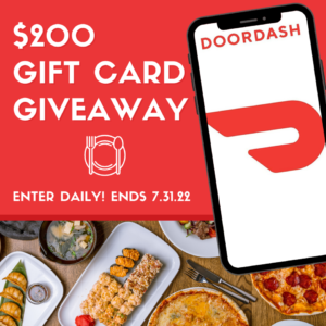 Enter for your chance to win a $200 e-Gift card to DoorDash! This giveaway is open to the US only where permitted, age 18 and older. This giveaway ends at 11:59 PM EST on 7.31.22. See below for terms and conditions