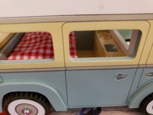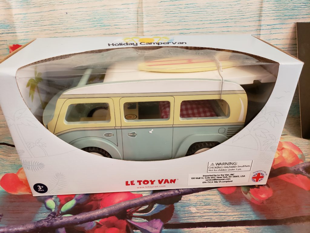 I can not begin to tell you how excited I was when I saw the Le Toy Van’s Holiday Camper Van.  I have always wanted a VW Bus and this was too cute to pass up. The detail on this Camper Van is beautiful it even has a surfboard that comes off to play with.
