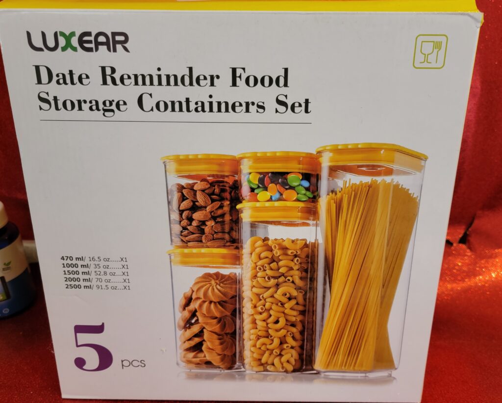 The Luxear Date Reminder Food Storage Containers Set comes with 5 different sized. I love to store my dry goods in these. It makes it easy when I am cooking to see right through the side what I am grabbing and the top makes it easy to make sure I use the oldest first.