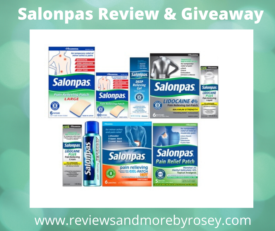 The kind folks at Salonpas want to give one lucky random Reviews And More By Rosey follower their very own assortment of Salonpas products. Please be sure to complete each task as all entries will be verified before any prize is awarded. Any fraudulent entries will be disqualified.