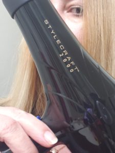 First thing I noticed with the Stylecraft 2000 was that it is so much smaller then my old full size was.  The last one was kind of a challenge to hold with one hand.  Now you are all going to think I am crazy but I have never had one that I can really change the setting on. Yes, speed but that was it.  So, I turned it on and though the air is cold.  Then I discovered not only can I change the speed, but I can also change the heat level. OMG awesome
